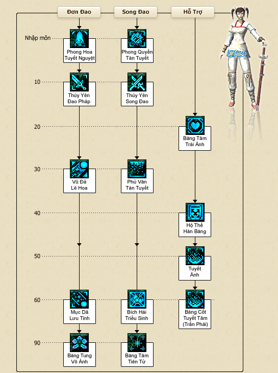 Hệ Thủy chỉ để cho nữ giới lựa chọn, đó có thể là phái Nga My chính phái hoặc phái Thúy Yên trung lập. Võ công của nữ nhi đều mềm mại và uyển chuyển như các cô vậy.